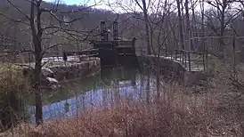 A village arose around the mill, taking its name. It was home to over 450 people, of whom over half worked in the mill.[6] Some residents immigrated from as far as Durham and Raleigh to find employment in Avalon. A few African-Americans also lived at the outskirts of the village and worked in the mill's dye house.[7] In addition to the mill, the town consisted of a dam and artificial canal, 60 company houses, a boarding house, a hotel, a company store, an ice cream parlor and a Moravian Church.[2][8] The second story floor of the store was used to host a school.[9] Electricity came from a water-powered generator at the mill.[2] No formal government was ever established in Avalon, so most events were either centered around the church or the mill.[10] On November 23, 1908 a fire destroyed the company store, causing an estimated $20,000 in damage.[11]