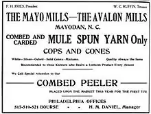 In 1887, Francis Henry Fries, a prominent businessman from Winston-Salem, constructed the Roanoke and Southern Railway, which stretched from his home town to Roanoke, Virginia. Seeking to develop industry along the rail line, Fries erected the Mayo Mill adjacent to the Mayo River in 1895 and established the town of Mayodan.[1] The Mayo Mill could not keep up with demand for yarn, so from 1899 to 1900 a new mill was built two miles to the north.[2] W. C. Ruffin, the superintendent of the Mayo Mills Company, gave it the name Avalon,[3] after Avalon, California.[2] Construction was undertaken by S. S. Ordway & Sons, an independent contractor.[4] At the time the four-story building was the largest textile mill in North Carolina. The south wall of the main building was made of wooden planks so it could be dismantled to allow for expansions and renovations.[5]