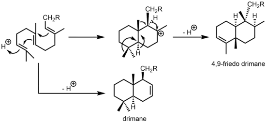 Terpenoid hydrocarbons, like the ones seen in Avarol's structure, are biosynthesised by the coupling of isoprene units in the form of isopentenyl pyrophosphate (IPP) to give polyenyl pyrophosphates. These are then transformed to the terpenes by terpene synthases. Coupling of two IPP molecules gives geranyl pyrophosphate (GPP) which is the precursor to all monoterpenes and the addition of another isoprene unit to gives farnesyl pyrophosphate (FPP), from which all sesquiterpenes are derived.[9] The cyclization of farnesyl pyrophosphate (FPP) takes place by an initial electrophilic attack at the head position of FPP giving rise to a concerted process leading to a bicyclic carbocationic intermediate from which the final products, drimane or 4,9-friedodrimane structural types are formed [10]