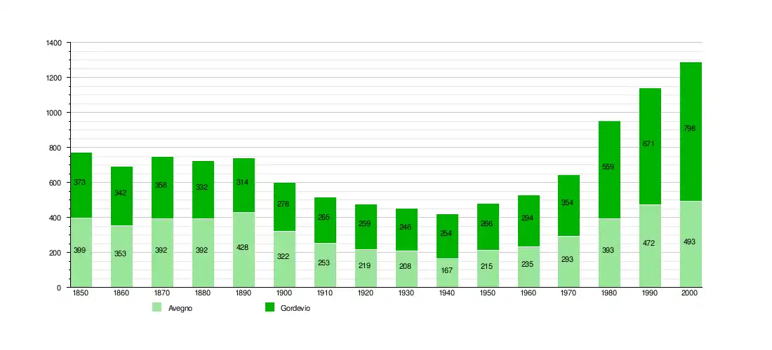 Avegno Gordevio has a population (as of December 2020) of 1,516, all Swiss citizens.[7]