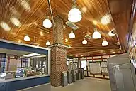 There are several doorways into the station house. The Avenue H facade, along the north side of the station building, consists of four bays with two wood-and-glass doors leading to the fare control area. The East 16th Street facade, along the east side, also is four bays wide but contains two wood-and-glass doors, a storefront, and a roll-down gate. There is modern signage along the exterior of the station house.[4]: 3–4 Inside the station house, there are turnstiles and a full-time booth. There is also a HEET adjacent to the station house, from which a stair leads to the northbound platform, and an underpass leads to a single staircase to the Coney Island-bound platform. Access to these stairs is also available via turnstiles in the underpass. There is an exit-only turnstile on either side of the underpass.[31]
