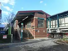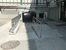 Another station house is on the north end of the southbound platform, adjacent to the west side of the track. The ADA-accessible ramp and a stair leads to the unstaffed brick station house. The ramp wraps around the station house to adjust for the height difference between the station house and ground level. This station house contains a bank of regular and High Entry/Exit Turnstiles.[31]