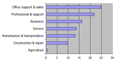 Overall those employed in office administrative and support, service and sales occupations constituted 38.6% of the labor force. Those employed in business and professional as well as professional support occupations (e.g. nurses) made up 38.0% of the labor force. Combined white collar employees including service workers such as restaurant serves and hotel maids constituted 76.6% of the labor force. If service workers are excluded 62.8% were employed in white collar occupations.