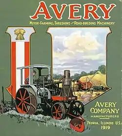 The Avery Company, founded by Robert Hanneman Avery, was an American farm tractor manufacturer famed for its undermounted engine which resembled a railroad engine more than a conventional farm steam engine. Avery founded the farm implement business after the Civil War. His company built a large line of products, including steam engines, beginning in 1891. The company started with a return flue design and later adapted the undermount style, including a bulldog design on the smokebox door. Their design was well received by farmers in central Illinois. They expanded their market nationwide and overseas until the 1920s, when they failed to innovate and the company faltered.[1] They manufactured trucks for a period of time, and then automobiles. until they finally succumbed to an agricultural crisis and the Depression.