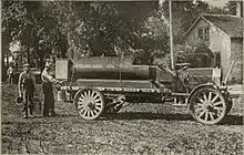 Avery started building agricultural trucks in 1910. Early truck manufacturers were uncertain how to market their product and whether they should just be used to haul goods or should also be useful in the field. Avery described its truck as a 'gasoline farm wagon' and 'general farm power machine' for city, town, and country hauling. Their advertising suggested the farmer could use it to haul livestock, grain, hay, and other loads, as to pull plows, road graders, harrows, discs, binders, and other farm machinery, as well as loaded wagons.[4] The truck weighed 1 short ton (0.91 t) and featured a four-cylinder engine, open cab and chain drive. Its wheels had wooden spokes and rims, while the steel tires were 1.5 inches (38 mm)x5 inches (130 mm) wide.[4] Avery figured farmers could get the most use out of the machines during the harvest season. Their tractor trucks included a large belt pulley that could be attached to the front crank shaft, useful for powering grain separators and other belt-driven machines. Early models had cast steel wheels with holes. Wooden plugs were driven into the holes to provide added traction. When the wooden plugs wore down, the owner simply replaced them with new wooden plugs.[8]