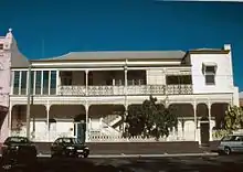 The building has two rendered masonry chimney stacks, and the rear of the structure has a first floor verandah which has been enclosed with fibrous cement sheeting and casement and glass louvre windows. Two timber framed stairs access the first floor flats, and the rear wall of the building consists of painted brickwork and quoining at the southern end and rendered brickwork at the northern end. The ground floor has a lean-to addition at the northern end with fibrous cement wall sheeting and a corrugated iron skillion roof. The southeast ground floor verandah space has been enclosed to form a laundry area.[1]