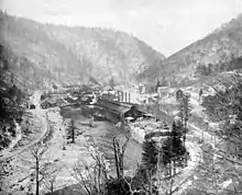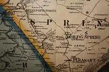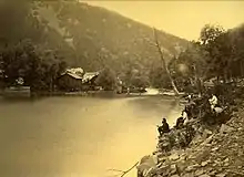 The main building was 350 feet long and 70 feet wide.[4] Production in 1855 was carried out by a workforce of fifty men. Wages were only $2.50 to $3 per day, but this was greater than the $1 wage received by local iron furnace workers.[5] An axe-finishing shop at Thomas Mill in Bellefonte was established in 1832 through partnership with Franklin Smith, but this venture failed after only a year. Its failure caused a split between the brothers, with Harvey assuming the debts.[6] Later, a finishing plant was added near Paradise (now Fisherman's Paradise; lower left on map above).[7]