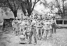 Factory capacity in 1855 was 500 axes per day.[16] Brand names included "William Mann Superior" and "William Mann’s Celebrated Axes." In March 1868, James added a trademarked label (no. D-2948), "The Red Warrior," which became a prominent name in the industry.[17] Location was indicated by the wording, "Manufactured Near Lewistown Penna." James also pioneered use of colorful paper labels. By the 1880s, the Reedsville factory was turning out an average of 1,400 axes per day.[18] In November 1880 the plant was damaged extensively by fire. It took three months for production to resume.