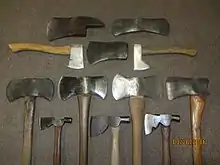 Around 1900, all-steel heads came into use. An online video from 1964 captures the effort required to make axes, including steeling the head and hanging ("hafting") a handle or haft.[2] Initially, output was limited to felling ("chopping") axes and soon grew to over 300 axe heads per day.[3]