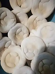 In making the biscuit you mix the cassava starch, coconut, sugar, salt and water together and after the mixture put it into the oven to bake within a particular temperature. The biscuit became brownish white after fully baked.[2]