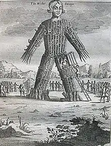 While the specific historical theories brought forward by Sammes were discounted by his contemporaries, his book was a contribution to a number of debates of the time, and its effect on iconography was major. The representations of Celtic druids had been developed from beginnings in Conrad Celtes and the Jani Anglorum (1610) of John Selden. Inigo Jones had made a druid stage design (1638) for Lodowick Carlell's The Passionate Lovers, drawing on earlier pageant representations of Ancient Britons, as a Wild Man. Further iconographic sources drawn upon were of the Green Man and hermits. As represented in Britannia Antiqua Illustrata the druid is a composite of "wild" and "holy".[5] John Wood, the Elder was prepared to take Sammes seriously, in theorising about Stonehenge.[6]