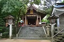Fukuoka prefecture is home to what is considered the ancestral shrine of the Azumi, Shikaumi Jinja. The shrine is presided over by a priest descended from the Azumi clan, and its biennial gojinkosai ceremony is designated an intangible cultural property by the prefecture.[20] The shrine and its rituals make use of a deer motif, common to the historic Azumi people.[2]