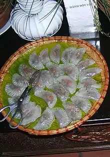 The dish's name is believed to have come from its clear, dumpling-like appearance, as the term bánh bột lọc loosely translates to "clear flour cake."[3] In Vietnamese, the word bánh can mean "cake" or "bread," but can also be used as a general term for foods that are made from any type of flour, the most common being rice or tapioca. Bột literally means flour, although it does not specify the type, and lọc means "refine" or "clarify."