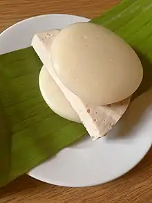 Bánh giầy (it can also be written as[1][2] written as bánh dầy or bánh dày) is a Vietnamese traditional cake. Bánh giầy is a white, flat, and round glutinous rice cake. They are wrapped in cut pieces of banana leaves. They are usually served with a type of Vietnamese sausage chả lụa.[3] Bánh giầy can be fried to a thin crispy golden crust or be eaten with chả lụa. Another variation is called bánh giầy đậu, where ground boiled mung bean (đậu xanh) - salted or sweetened - is stuffed inside. It is very similar to other Asian glutinous rice cakes like Japanese mochi, Korean tteok or Chinese lo mai chi.