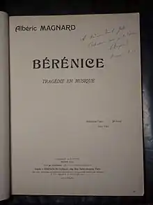 Bérénice is an opera in three acts by the French composer Albéric Magnard to his own libretto after the tragedy of the same name by Racine. It was first performed at the Paris Opéra-Comique on 15 December 1911. The work received only nine performances at the Salle Favart in its first 40 years.[1]