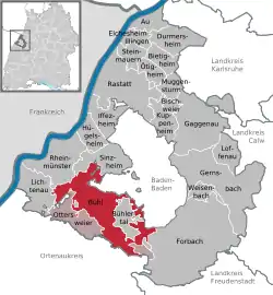 Bühl is a town in the southwestern state of Baden-Württemberg, Germany, about 10 km (6.2 mi) South of Baden-Baden. Bühl is the third largest town in Rastatt County (Landkreis), after Rastatt itself and Gaggenau. Due to its location, size and importance it has become a central place for numerous towns, townships and villages in the neighbourhood. Bühl was proclaimed a major district town (Große Kreisstadt) on 1 January 1973, after it lost its status as an independent county seat during municipal reforms in Baden-Württemberg. Bühl has agreed to form a joint administrative community with the municipality of Ottersweier.