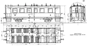 In the period 1909–1929, 411 wagons in classes BL, BCL, CL, DL and PPostL were procured.[1] They all had a standard floor plan, open end-platforms with Dixi gates on the steps and gangways secured only by an iron railing. Large window panes were installed instead of the composite windows that had been usual up to that point. Of the coaches built to Design Sheet 521, 18 were procured in two batches, in 1909 and 1911, from SE in Nuremberg and Rathgeber in Munich.