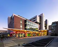 In 2003, a $28 million expansion saw the opening of a new Ambulatory Care Building, for the increasing numbers of patients not needing to stay overnight.[7] The building tripled the number of clinic rooms available on site for patients and staff, and houses 24 pediatric specialty medical and surgical clinics.[7] The architects state that the building "is nearly 40% more efficient than the National Energy Code called for when it was built. Sustainable design features include orientation toward solar exposure, maximization of natural ventilation and natural daylight, concourse ventilation, insulated north walls, reduction in electrical power consumption through daylighting, task lighting, and light and occupancy sensors."[8] The project also involved the nearby B.C. Women's Hospital & Health Centre's new Maternity and Ambulatory Program Clinics, Child and Adolescent Psychiatry, and the Emergency renovation and expansion.[8]