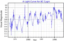 The brightness of BC Cyg varies from visual magnitude +9.0 and +10.8 with a period of 720 ± 40 days.[1] Between around the year 1900 and 2000 appears to have increased its average brightness of 0.5 magnitudes.[3]