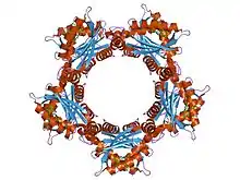 In molecular biology, the BLUF domain (sensors of blue-light using FAD) is a FAD-binding protein domain. They are present in various proteins, primarily from bacteria, for example a BLUF domain is found at the N-terminus of the AppA protein from Rhodobacter sphaeroides. The BLUF domain is involved in sensing blue-light (and possibly redox) using FAD and is similar to the flavin-binding PAS domains and cryptochromes. The predicted secondary structure reveals that the BLUF domain has a novel FAD-binding fold.[1]