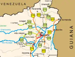 BR-401 is a federal highway in the state of Roraima in Brazil. The 202.9 km (126.1 mi) road[1] connects Boa Vista with Normandia and the road network of Guyana.[2][3]