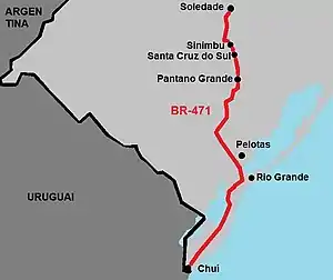 The BR-471 is a Brazilian federal highway that connects the cities of Soledade and Chuí, in the state of Rio Grande do Sul. It has a total length of 648.2 km.[1]