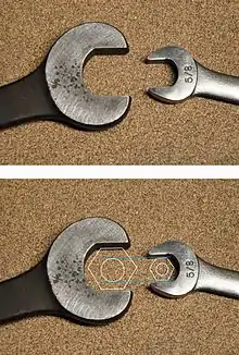 During World War II the smaller size hexagon was adopted more widely to save metal[9] and this usage persisted thereafter. Thus it is today common to encounter a Whitworth hexagon which does not fit the nominally correct spanner and following the previous example, a more modern spanner may be marked 7⁄16 BS to indicate that they have a jaw size of 0.710 in and designed to take either the (later) 7⁄16 BSW or 7⁄16 BSF hexagon.[10][11][12]
