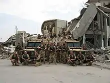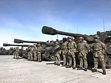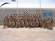 In 1996, the Battery deployed on Op RESOLUTE to Bosnia as part of the NATO lead IFOR. Initially, B Battery were to be based in Baraci but due to reductions in theatre, it was decided that three gun batteries were not required at that location. The Battery was teamed up with L (Nery) Battery to form B/L Battery and was based in Glamoc. From here, the Battery conducted deployments with its Troop of guns through Multi National Division South West. After a successful tour, B Battery returned to the UK in January 1997. Following a period of leave, B Battery then started pre-BATUS training, again joining forces with L Battery to support 1st RWF Battle Group. Just prior to deploying, the Battery took the lead in supplying manpower to the Royal Tournament at Earls Court, London, the largest military tattoo in the world at the time. This had members of the Battery assisting in a variety of jobs from taking part in the show to the necessary backroom work. 1988 saw B Battery deploy again to Glamoc, Bosnia, this time as part of SFOR. When the Battery returned in January, 1999, little did they realise that by June the same year the TAC Group would find itself spearheading the advance of the NATO force into Kosovo. The TAC Group saw at first hand the destruction that the Serbs had tried to inflict on the local population during the conflict. The TAC Group returned to Tidworth in September. In 2000, the Battery deployed on Exercise GRAND PRIX in Kenya to support the Argyll and Sutherland Highlanders. Here, the Battery was equipped with the 105mm Light Gun. The Battery had an extremely good exercise and conducted some great infantry training as well as firing the guns. On return from Kenya, the Battery made it to the final of the RA Inter-Battery football against 132 Bty and won 6-0. Once again, the Balkans reared its head and this time Sahagun Troop deployed with L/N Bty to Kosovo and Downman’s Troop to Sanski Most with Chestnut Troop. 2001 saw B Battery training up to support the King's Royal Hussars on Exercise IRON ANVIL in BATUS as part of 19 Regiment RA in support of 12th Mechanised Brigade. On return to the UK, the Battery commenced a build-up to deploy back to the Balkans as the UK Artillery Battery based in Sipovo. B Battery was the last Gunner unit, in role, in the Balkans. Back in the UK, the Battery immediately re-rolled to provide cover for the National Fireman’s strike. The Regiment deployed to Cheshire and the Battery initially covered Warrington, Runcorn and Widnes. This commitment lasted intermittently between October 2002 and March 2003. The Battery also conducted a Brigade level exercise in BATUS with the Regiment before being warned off for Operation TELIC 4.[2]
