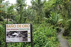 The Baño de Oro Historic Site (Spanish for golden bath) is a historic recreation center and swimming pool located in the Baño de Oro area of El Yunque National Forest in Río Grande, Puerto Rico. The site of Baño de Oro gets its name from the Baño de Oro Creek,[1] which itself is named after the former Spanish gold panning sites in the area.[2] The wider Baño de Oro Natural Area where the historic site is found was named a National Natural Landmark in 1980 and it is the only contiguous area in Puerto Rico that contains a subtropical wet forest, a rainforest, a dwarf forest, and a Pterocarpus forest.[3]