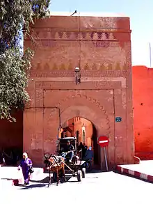 The Kasbah of Marrakesh, built by the Almohad sultan Yaqub al-Mansour, is the site of the El Mansouria Mosque, the El Badi Palace and the Saadian Tombs. Bab Ksiba was the entrance to another small kasbah (ksiba or qusayba) which was adjoined to the southwestern corner of the main kasbah in order to protect the western side of the Grand Mechouar (a vast open square, still present today, at the entrance of the royal palace) and the Derb Chtouka neighbourhood.[1] The date of its construction is unclear; it existed at the beginning of the 19th century and may have been built under Muhammad ibn Abdallah in the 18th century, but was almost certainly not part of the original Almohad kasbah.[1]: 501