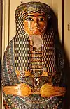 It contained 254 richly decorated coffins (101 double sets) giving 153 coffin sets in total, as well as 110 shabti boxes, 77 Osirian wooden statuettes (mostly hollow and containing a papyrus), 8 wooden steles, 2 large wooden statues (Isis and Nephthys), 16 canopic reed baskets, 5 round baskets made of woven reed.[6] The coffins were made almost exclusively with wood from the native fig tree, the Ficus sycomorus.[7]