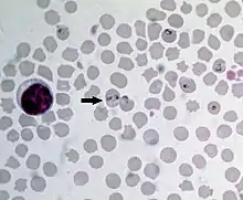 Babesia bovis is transmitted transovarially, from the female ticks to the eggs, and can remain resident in tick populations for up to four years without infecting a vertebrate host. More commonly, a larval tick feeds upon a domestic cow, an African buffalo or a water buffalo, releasing the parasites into the animal's bloodstream. The involvement of the larval stage of the ticks in the cycle is specific to B. bovis; other Babesia species only involve adult ticks. The parasites then invade individual red blood cells, multiplying and destroying the host cells until the animal is stricken with hemolytic anemia.[1] Adult ticks which feed upon infected cattle are infected themselves, completing the cycle. In humans, infection is rare and usually only affects splenectomized patients.[4]