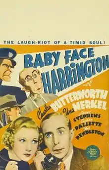 Baby Face Harrington is a 1935 American comedy film directed by Raoul Walsh and written by Nunnally Johnson, Edwin H. Knopf and Charles Lederer. The film stars Charles Butterworth, Una Merkel, Harvey Stephens, Eugene Pallette and Nat Pendleton. The film was released on April 12, 1935, by Metro-Goldwyn-Mayer.[3][4]