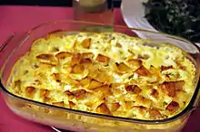 Bacalhau com natas (literally "cod with cream") is a popular way of cooking salted cod (bacalhau) in Portugal.[1] It is an oven-baked dish consisting of layers of bacalhau, onion, diced fried potato and cream, commonly spiced with nutmeg and white pepper. [2] Use of dairy such as cream or cheese is not common in traditional Portuguese savoury dishes; however, the popularity of this dish—in households and restaurants—make it a classic. The origin of this dish is unclear, but a similar one using cod and cream was invented by chef João Ribeiro in the 1930s.