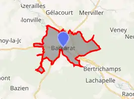 Baccarat is located some 25 km south-east of Lunéville and 30 km north-west of Saint-Dié-des-Vosges in the Meurthe river valley between the Deneuvre plateau and the wooded hills of Grammont. Access to the commune is by the Route nationale N59 from Bertrichamps in the south-east which passes through the heart of the commune east of the town and continues north-west to join the N333 south-east of Lunéville. The D590 also goes from Bertrichamps and passes through the town continuing north-west to Azerailles. The D19 goes north from the village to Gélacourt. The D935 goes north-east from the town to Merviller and also south-west, changing to the D435 at the departmental border, to Ménil-sur-Belvitte.[6] A railway also passes through the commune with a station near the town and the railway line coming from Azerailles in the north-west continuing to Bertrichamps in the south-east. The commune has a large forest in the east with the rest of the commune mixed forest and farmland. The Meurthe river passes through the commune and the town from the south-east flowing north—west to eventually join the Moselle at Custines. The Ruisseau des Bingottes rises east of the commune and joins the Meurthe in the south of the commune.