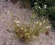 This is a shrub generally growing 40-100 centimeters (16-40 inches) in height, and known to exceed 2 meters (80 inches) at times. The erect stems have a woody base and are mostly hairless, but may be sparsely hairy near the ends of the branches. The narrow, widely spaced leaves are linear or lance-shaped and smooth-edged or slightly serrated, and measure 1.5 to 6.5 centimeters in length but only a few millimeters in width. They are glandular and hairless or with few hairs. The inflorescence is an elongated cluster of many flower heads containing twenty to thirty or more male or female flowers. The fruit is a hairy achene tipped with a plumelike white pappus about 7 millimeters long.[4]