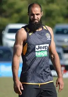 Houli turned in a series of strong performances in the 2008 pre-season NAB Cup tournament, including with 17 disposals in the first half of a match against West Coast that saw AFL Media label him among his side's best players.[25] In addition to previous roles as a half-forward and midfielder, he began playing as a half-back during this time.[26][27][28] Those efforts saw him hold his place into the season-proper, where he played in a dual role as midfielder and half-back and recorded 26 disposals in a win over the Kangaroos that earned him the league's first Rising Star nomination of the year.[29] Though he missed round 9 with a virus, Houli otherwise held his place at senior level over the first 11 weeks of the season, playing primarily on the club's half-back line, including with a two-goal, 23-disposal game in round 5 that earned him his first Brownlow Medal vote.[30][23][31] To that point he ranked third in the club's best and fairest count.[32] Houli missed round 12's match against West Coast with a groin injury, which after several weeks of rehabilitation and little progress, was identified as the beginning of osteitis pubis.[33] The injury required surgery to repair and would effectively rule him out for the remainder of the season.[34][35] Houli played 10 AFL matches and averaged 19 disposals per game in 2008, earning himself 17th place in the club's best and fairest count.[23][36]