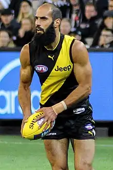 Houli suffered a minor calf injury in the club's opening pre-season match of 2018, the recovery for which held him out of the rest of the pre-season series and from the round 1 match-up against Carlton.[154][155][156] He returned to fitness for round 2's grand final rematch against Adelaide and contributed 17 disposals.[157][23] AFL Media named Houli among Richmond's best players in four of the next five matches, including in his 150th match for Richmond in round 7.[158][159][160][161] In the first quarter of round 10's match against St Kilda, Houli suffered a serious groin injury while kicking that saw him removed from the game after notching just four disposals.[162] Although the injury did not require surgery, Houli spent six weeks rehabilitating the muscle, during which time he also underwent finger surgery to repair an unrelated injury.[163][164][165] He made a return to football in round 17, but further groin soreness forced him to limit the stint to just one match.[166][167] Houli spent a further two weeks on the sidelines before making a return to football in limited game time in one VFL match in early-August.[168][169] Finally fit, Houli played at AFL level again in round 21 and earned one coaches vote for a 26 disposal outing against Gold Coast.[170][171] Houli was an honoury captain the following week, joining fellow Muslim player and Essendon opponent Adam Saad to toss the coin in support of the Muslim-Australian community who had been the subject of racist comments by conservative Senator Fraser Anning in Parliament that week.[172][173] After helping Richmond to the minor premiership as the ladder-leading side at the end of the home and away season, Houli contributed 24 disposals and four tackles in a qualifying final win over Hawthorn.[23][174] Houli was one of Richmond's few strong contributors in the preliminary final the following week, notching 22 disposals and a goal in what would prove a shock knock-out loss to Collingwood that ended Richmond's season and limited Houli to just 15 matches at AFL level that year.[175][176]