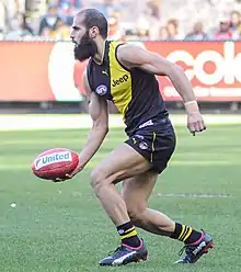 He immediately earned AFL selection, making his debut for the club in round 1's season opening match against Carlton.[23] In round 5, Houli recorded 30 disposals and was named by AFL Media as one of his side's best players.[69] He played a dual role as a midfielder and defender and continued to impress over the following months, including with a two-goal haul in round 7's win over Fremantle and 30 or more disposals in rounds 6, 10 and 17.[70][71][72][23][73] Houli was also best afield and received the maximum three Brownlow Medal votes following a then career-best 32 disposals in a round 21 win over Sydney.[23][74] By season's end Houli had solidified himself as an important rebounding half-back for Richmond, playing in all 22 matches that season and earning the Fred Swift Medal for fourth place in the club's best and fairest count.[75][76]