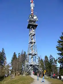 Bachtel Tower (German: Bachtelturm) is a 60 m (200 ft) tall radio tower on 1,115 m (3,658 ft) high Bachtel mountain near Hinwil, Switzerland, overlooking the Zürcher Oberland. Bachtel Tower is a lattice tower whose observation deck, 30 m (98 ft) metres above the ground, is accessible by a stairway. It was built as replacement for a smaller observation tower on the site in 1986. On the observation deck of Bachtel Tower there is an illustration with the names of the mountains of the Swiss Alps visible. This illustration was designed by Paul Thalmann from Wernetshausen near Hinwil.