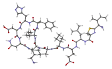 Bacitracin[1] is a polypeptide antibiotic. It is a mixture of related cyclic peptides produced by Bacillus licheniformis bacteria, that was first isolated from the variety "Tracy I" (ATCC 10716) in 1945.[2] These peptides disrupt Gram-positive bacteria by interfering with cell wall and peptidoglycan synthesis.
