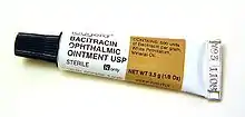 As bacitracin zinc salt, in combination with other topical antibiotics (usually polymyxin B and neomycin) as an ointment ("triple antibiotic ointment," with the brand name Neosporin), it is used for topical treatment of a variety of localized skin and eye infections, as well as for the prevention of wound infections. A non-ointment form of ophthalmic solution is also available for eye infections.[7]