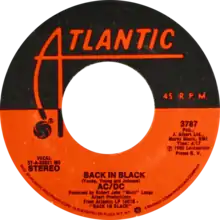 "Back in Black" is a song by Australian rock band AC/DC. It was released as the second US single from their seventh album of the same name in 1980 through Atlantic Records. It is notable for its opening guitar riff. The song was written as a tribute to their former singer Bon Scott, who died in February 1980. In 1981, it reached number 37 on the Billboard Hot 100. In 2012, it reached number 65 in Australia and number 27 in the United Kingdom.