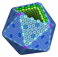 The BMC shell appears icosahedral or quasi-icosahedral, and is formed by (pseudo)hexameric and pentameric protein subunits.[26] Structures of intact shells have been determined for three functionally distinct: BMC types, carboxysomes,[27] the GRM2 organelles involved in choline catabolism[28] and a metabolosome of unknown function. Collectively, these structures shown that the basic principles of shell assembly are universally conserved across functionally distinct BMCs.[29][26]