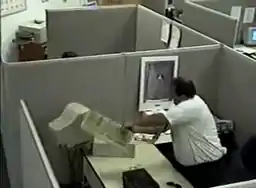 In the surveillance-style video, an office worker in his cubicle is becoming increasingly irritated with the computer.[1] He slaps the monitor and pounds on the keyboard with his fist before picking the keyboard up and using it like a baseball bat to knock the monitor off of the desk.[1] His neighbor peers over the partition twice in curiosity.[1] The video ends with the protagonist kicking the monitor out of their cubicle.[1]