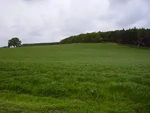 The summit of the hill is the site of an Iron Age hill fort known as Badbury Camp. It is roughly circular in shape, most of which was levelled early in the 19th century.[1] It has been suggested as a possible site of the 5th or 6th century Battle of Mons Badonicus, where King Arthur defeated the Anglo-Saxons. It is now a wooded area, known locally as Badbury Clump, of roughly nine acres, swathed in bluebells in May and is a well-frequented local recreation area, for walkers and dog-owners.[2] It is now in the care of the National Trust.[3][4]