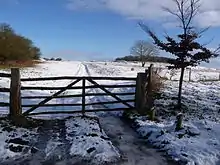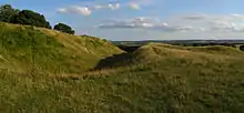 Until 1983 Badbury Rings was privately owned as part of the Kingston Lacy estate, and the owners discouraged investigation of the site.[2] The site now belongs to the National Trust.[2] A survey of the hillfort by the RCHME was begun in 1993.[1] The summit area was cleared of undergrowth by the National Trust in 1997 and the conifer plantation was thinned out.[1] This allowed the RCHME to complete the survey in 1998, which recorded 28 potential hut sites within the ramparts,[3] although some depressions are probably caused by uprooted trees.[1] The first excavations, led by Martin Papworth, took place in 2004, when three evaluation trenches were dug.[3] Almost all of the pottery found was dated to the Late Iron Age.[4] The current evidence does not suggest that the hillfort was a principal settlement in the Early Iron Age.[4] It seems likely that the hillfort became depopulated towards the end of the Late Iron Age, perhaps as the Vindocladia settlement near Shapwick developed.[5]
