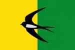 Badia del Vallès uses an heraldic flag which follows the same pattern as its shield, and is defined as an "Oblong flag of proportions two high by three long, two-tone yellow and green vertical stripes, with the black swallow with the white chest of the shield, height 5/7 of the cloth, centered in the middle of the partition."[4]