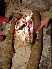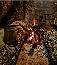 When evening comes, the badnjak log is placed in the hearth. In Dalmatia, as the badnjak is brought into the home, it is sprinkled with wine and grain. In the southern part, women would adorn the logs with leaves and flowers and wrap them around with red and gold ribbons.[6] In Dubrovnik, the father sprinkles corn and wine on the badnjak while reciting prayers. In other regions, the badnjak is sprinkled with wheat and holy water, while in Hercegovina the badnjak is completely bathed in holy water.[7] As the log is lit, the father of the family recites the Apostle's Creed. In southern Dalmatia, two logs are often placed in the shape of a cross. After the log is lit, he says "Jesus be praised. Welcome Christmas Eve." Sometimes, more holy water is sprinkled on the badnjak after it is lit. Depending on the region, people may choose to sprinkle bits of wheat grain, or even add some of the evening meal to the badnjak. In Istria, if wine or rakija is sprinkled on the badnjak, a family member toasts: "Drink to your health" (Pij u tvoje zdravlje) believing if they don't then ill fortune will come to them. The log is usually allowed to burn all night into Christmas Day, and family members often take turns all night ensuring the log does not go out.