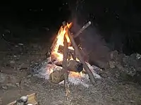 There are many interpretations for the meaning of the badnjak, but scholars agree that it is a remnant of pagan Indo-European times that has adapted to Christianity. Today, the festive kindling of the log commemorates the fire that—according to folk tradition—the shepherds of Bethlehem built in the cave where Jesus Christ was born, to warm the baby Jesus and his mother Mary throughout the night. The badnjak may also be seen as a symbol of the cross upon which Christ was crucified, the warmth of its fire symbolizing the salvation which, in the Christian belief, the crucifixion made possible for mankind. As the log burned and turned into ashes, it symbolized Christ's resurrection and his triumph over sin. Scholars regard the tradition as inherited from the old Slavic religion, where Christians began referring to the celebration of Christmas as the Feast of Lights.[2] They interpret the badnjak as an incarnation of the spirit of vegetation, and as a divinity who dies by burning to be reborn, to whom sacrifices and prayers were offered for the fertility of fields, the health and happiness of the family, in which the rekindling of the hearth-fire symbolizes its importance and center of family life throughout many generations.[3] In some parts, some people focus more on the cult of their dead, where they equate the burning fire to their departed family members.[4]
